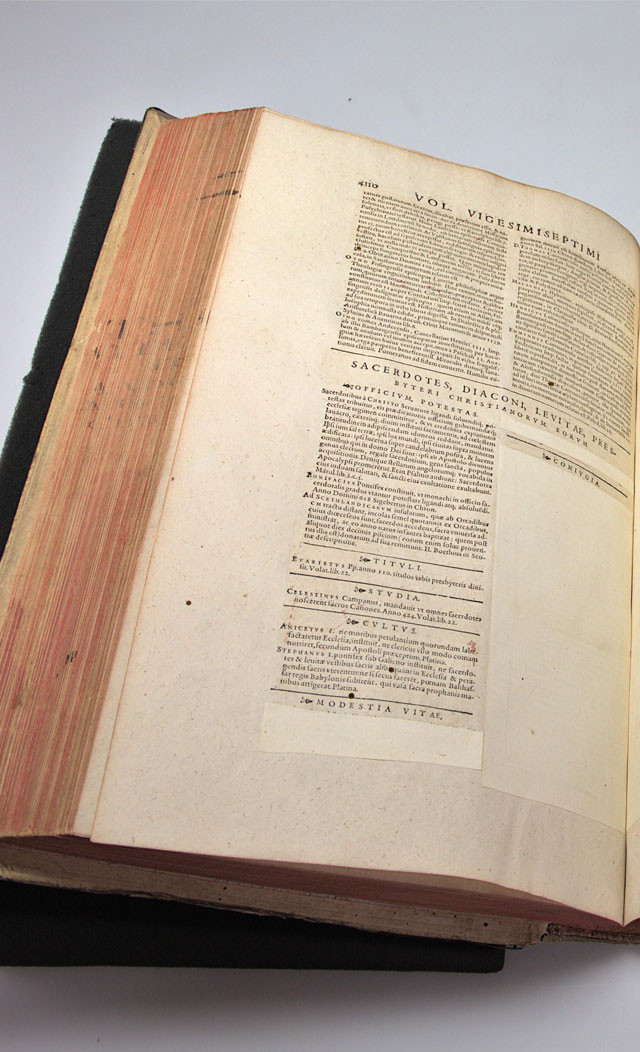 Theodor Zwinger war in Basel aufgewachsen, einem wichtigen Zentrum der reformierten Konfession. Er selbst vertrat eine Lehre der Toleranz und griff den religiösen Dogmatismus auf allen Seiten des Glaubenskonfliktes an.[6] Im Zeitalter der konfessionellen Auseinandersetzungen duldeten die katholischen Autoritäten solche Angriffe nicht und veranlassten daher deren Zensur. Wie weit sie dabei gingen, demonstriert ein Beispiel aus dem 27. Band des Theatrum: Zum Thema Modestia Vitae, also der bescheidenen Lebensführung Geistlicher, hatte Zwinger erstens einen Beschluss des spätantiken Papstes Zosimus zitiert, der Geistlichen das Trinken in der Öffentlichkeit verbot, und zweitens einen Beschluss der Synode von Seligenstadt 1023, der nächtlichen Alkoholkonsum vor dem Feiern der Messe rügte. Dieser Synodalbeschluss sollte aus dem Theatrum entfernt werden – vielleicht, weil er ein schlechtes Licht auf den getadelten Klerus warf? Im Exemplar der Kölner Jesuiten wurde jedenfalls der darüberliegende Satz, der auf Zosimus verwies, mitgetilgt – sei es aus Versehen oder weil der Zensor auch daran Anstoß fand. Dass die unkenntlich gemachten Textpassagen mitunter auch die hitzig umkämpften Streitfragen des konfessionellen Zeitalters betrafen, zeigt hingegen direkt die nachfolgende Passage: Gleich zwei Seiten widmete Zwinger der Frage nach der Priesterehe und dem Zölibat. Als Einleitung dazu führt er einen Synodalbeschluss von 1119 während des Pontifikats Papst Calixt II. auf, der Priestern und Diakonen nicht nur die Ehe, sondern auch das Zusammenleben mit Konkubinen verbot. Zwinger ließ es sich nicht nehmen, auch noch ein kurzes Schmähgedicht abzudrucken, in dem Calixt der Hass des gesamten Klerus angedichtet wird. Das Theatrum bezieht nicht wirklich Stellung, präsentiert aber eine Auswahl an Informationen, die Zweifel an der katholischen Lehrmeinung hervorrufen – also jener Lehrmeinung, die von der Zensur geschützt werden sollte.